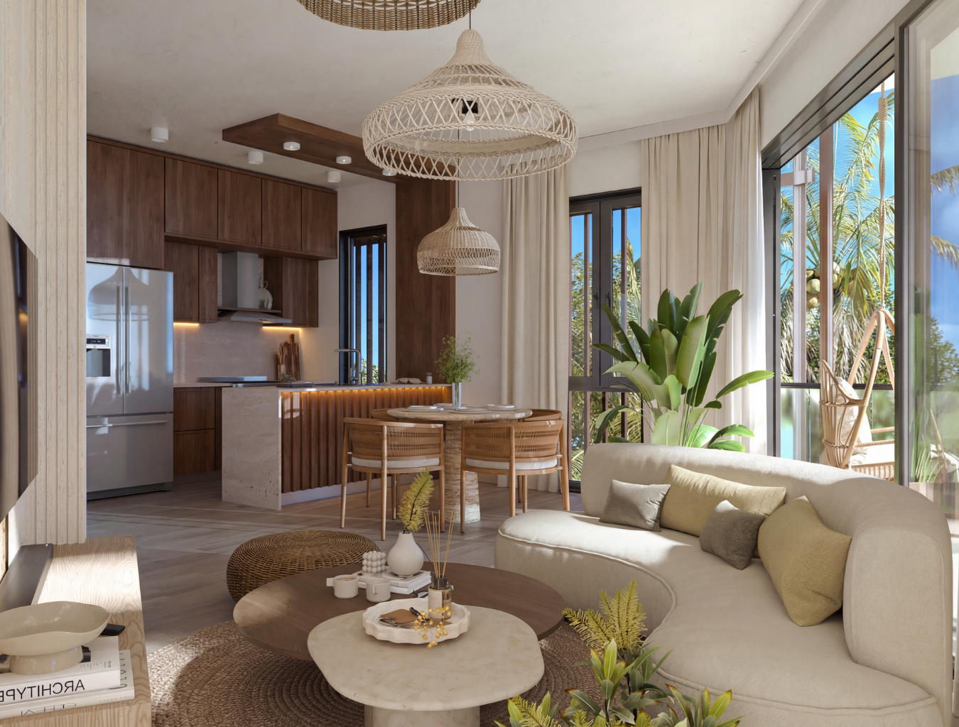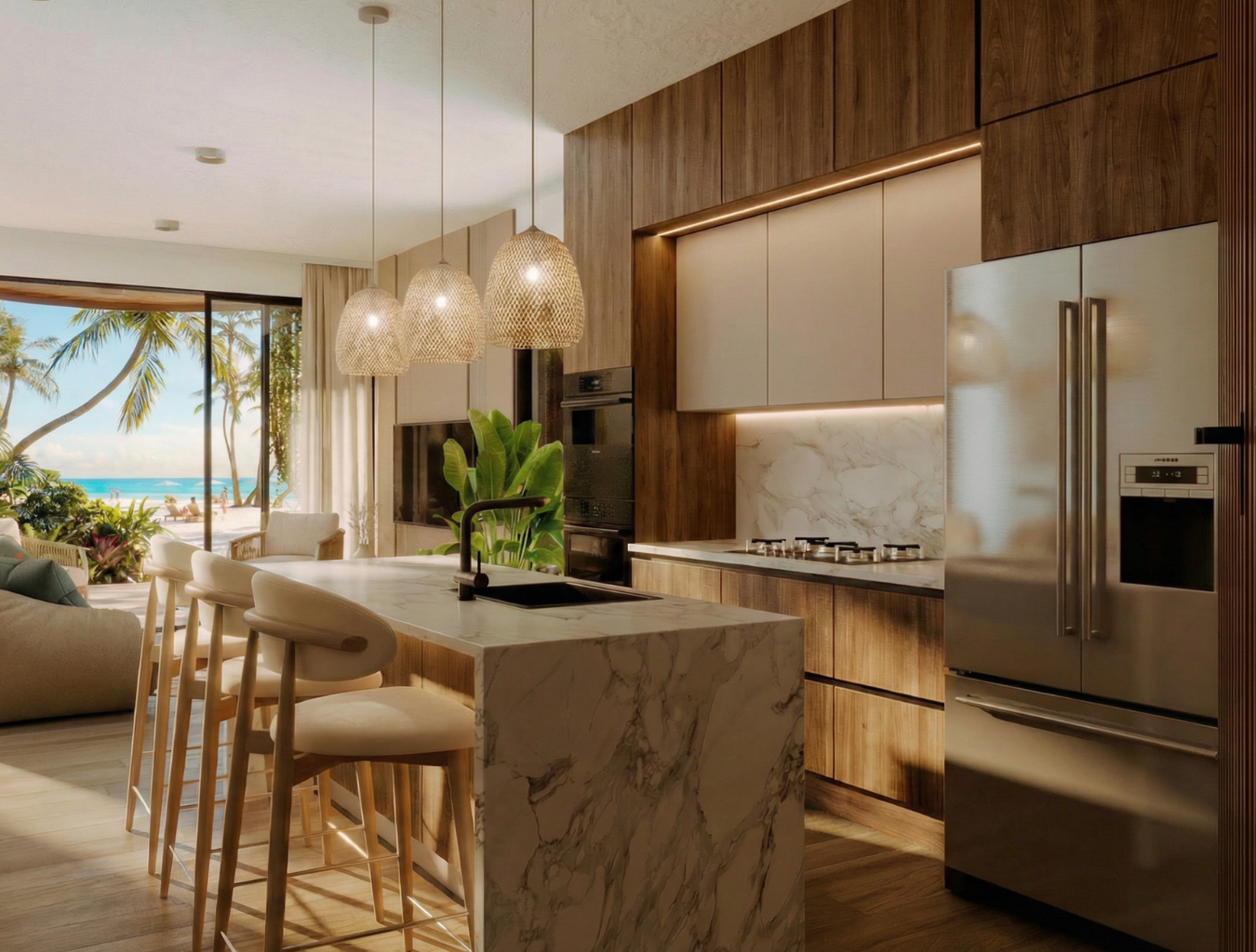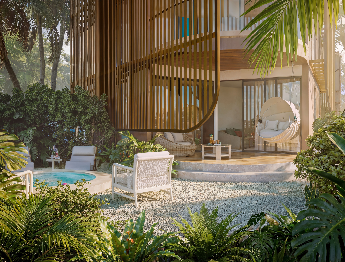 Nuestros apartamentos están diseñados para integrarse armónicamente al entorno y ofrecer una experiencia de bienestar total. Cuentan con ascensor, escalera común, fachada bioclimática y fácil acceso a piscina y playa. Las unidades de 3 habitaciones incluyen doble acceso y terminaciones de lujo.